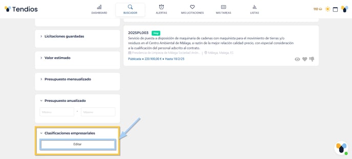 Ya puedes utilizar el buscador. Sólo te aparecerán aquellas licitaciones cuyas clasificaciones empresariales sean las que hayas determinado.