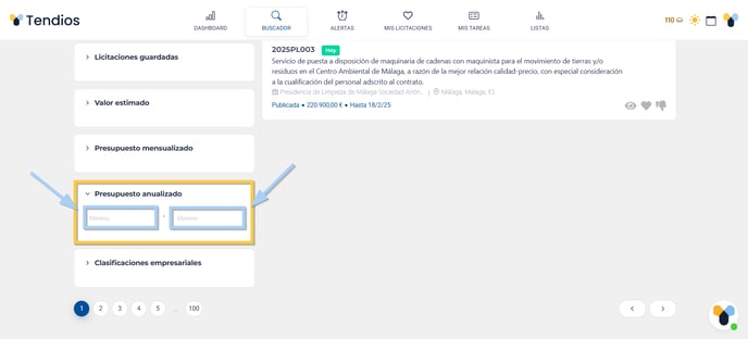 Ya puedes utilizar el buscador. Solo te aparecerán aquellas licitaciones en las que su presupuesto esté contenido en el rango que hayas determinado.