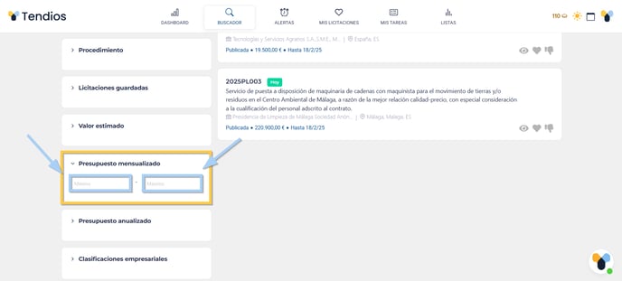 Buscar licitaciones filtrando por presupuesto mensualizado