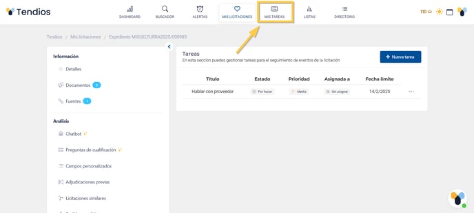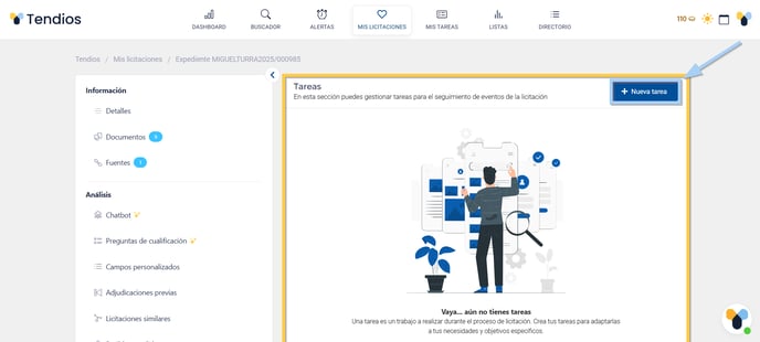 Desde aquí podrás ver todas tus tareas creadas para esta licitación. Para crear una nueva tarea, pulsa en Nueva tarea.