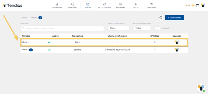 Haz clic en cualquiera de tus alertas creadas para acceder a sus funcionalidades.