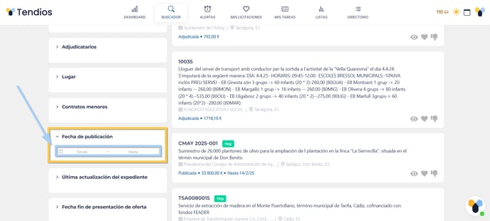 Localiza el filtro de Fecha de publicación y determina el período de tiempo en el que quieres que se hayan publicado las licitaciones que quieres buscar.