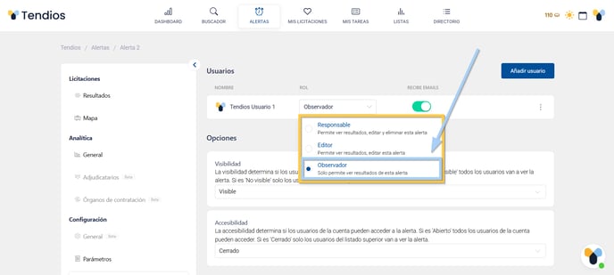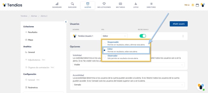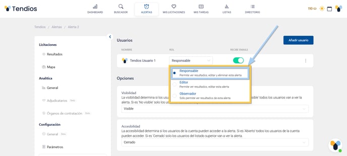 Modifica el rol de un usuario en una alerta para ajustar sus permisos y responsabilidades en el seguimiento de las licitaciones