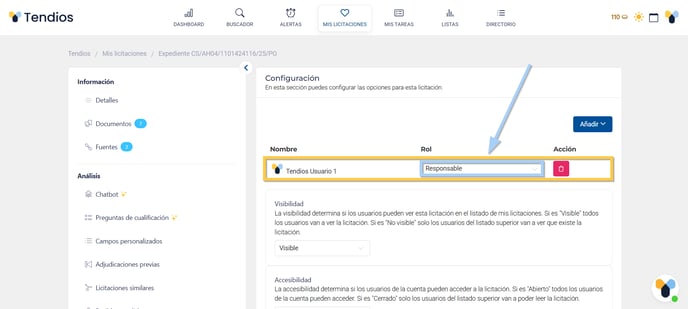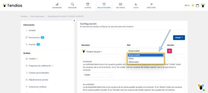 • Responsable: Permite al respectivo usuario ver resultados, editar y eliminar esta licitación. Para seleccionar este rol haz clic en el botón Responsable.