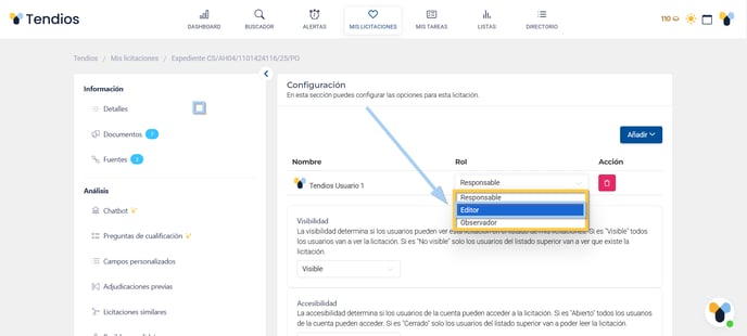 • Editor: Permite al respectivo usuario ver resultados y editar esta licitación. Para seleccionar este rol haz clic en el botón Editor.