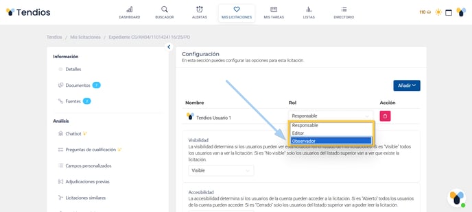 • Observador: Permite al respectivo usuario solo ver resultados de esta licitación. Para seleccionar este rol haz clic en el botón Observador.