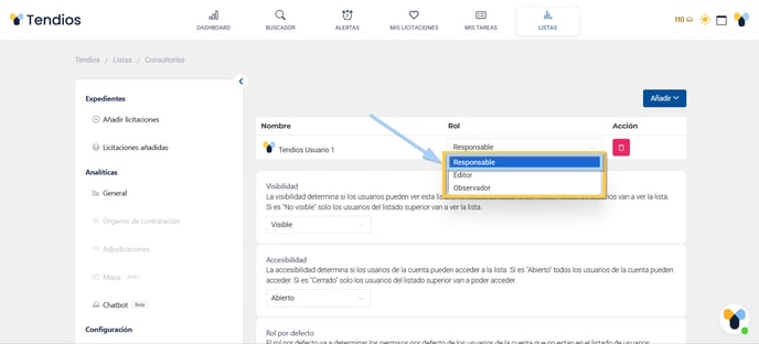 • Responsable: Permite al respectivo usuario ver resultados, editar y eliminar esta lista. Para seleccionar este rol haz clic en el botón Responsable.