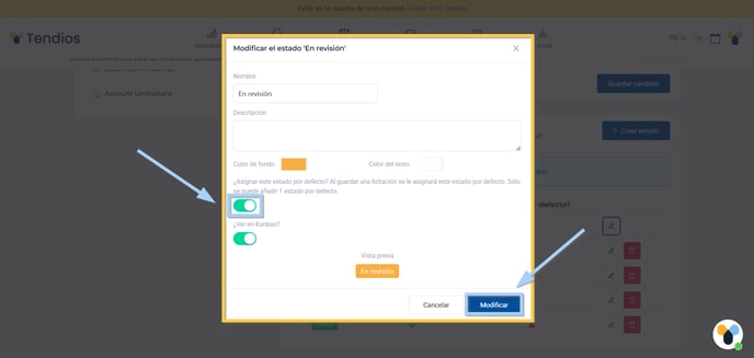 Ajusta la columna predeterminada en el Kanban para que todas tus licitaciones guardadas se ubiquen automáticamente en el estado que prefieras
