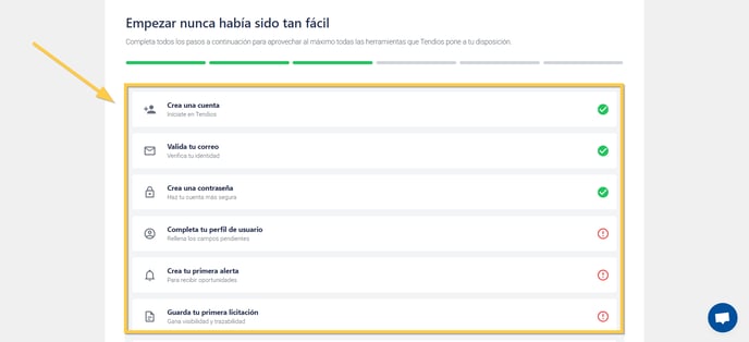 Desde aquí puedes seguir nuestra guía para aprender a Crear tu primera alerta, Guardar tu primera licitación y acabar de completar tu Perfil de usuario. Simplemente, haz clic en cualquiera de las pestañas por la que quieras empezar.