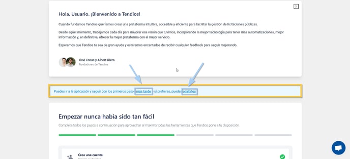 Si por el contrario ya estas familiarizado con Tendios, puedes hacer clic en el botón Más tarde para posponer la guía u Omitir para ignorarla.