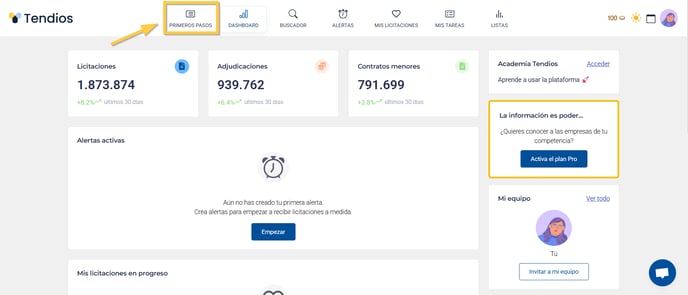 Mientras vayas completando la guía, tienes acceso total a la página web. Navega y explora para habituarte a la interfaz. Si aún tienes dudas, haz clic en el botón Primeros Pasos situado arriba a la izquierda.