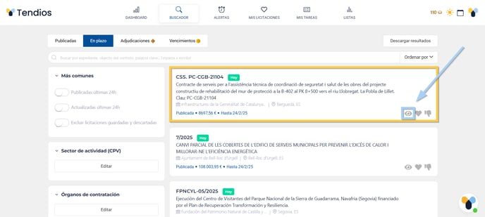 Una vez hayas encontrado la licitación, pulsa en el icono del ojo situado abajo a la derecha.