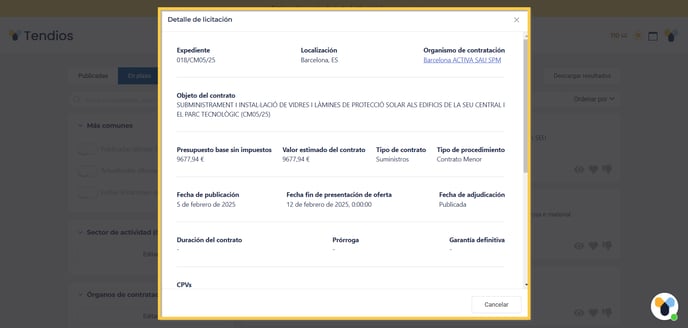Desde aquí puedes ver los detalles más importantes de la licitación. Estos son: