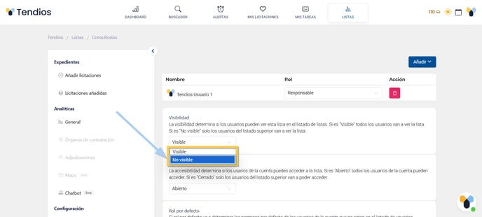 • No visible: Haz clic en el botón No visible si quieres que ningún usuario de la cuenta excepto los que hayas invitado pueda ver esta lista en el listado de listas.