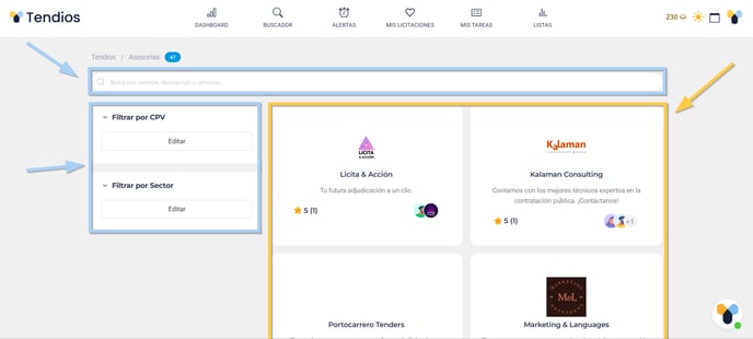 Ya puedes buscar aquella consultoría con la que te quieras vincular. Para ayudarte, puedes utilizar los filtros y el buscador. Para ver los detalles de una consultoría, haz clic en su panel.