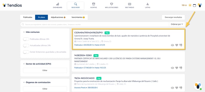 Haz clic en cualquier licitación. La puedes encontrar desde el buscador, desde tus licitaciones guardadas o desde una alerta.