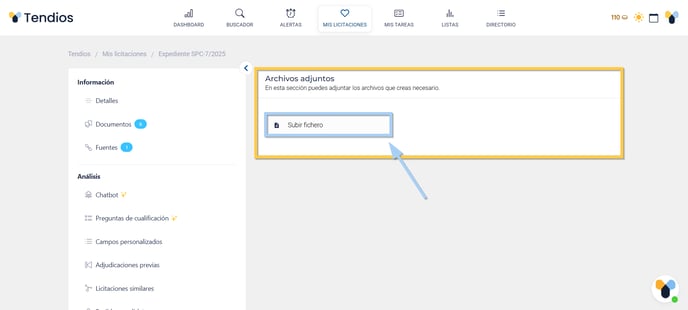 Pulsa en el botón Subir fichero. Estos archivos serán visibles para todos los usuarios que tengan acceso a esta licitación.