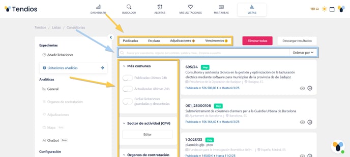 Consejo: Si tienes muchas licitaciones añadidas, puedes utilizar los filtros y el buscador para facilitarte la búsqueda.