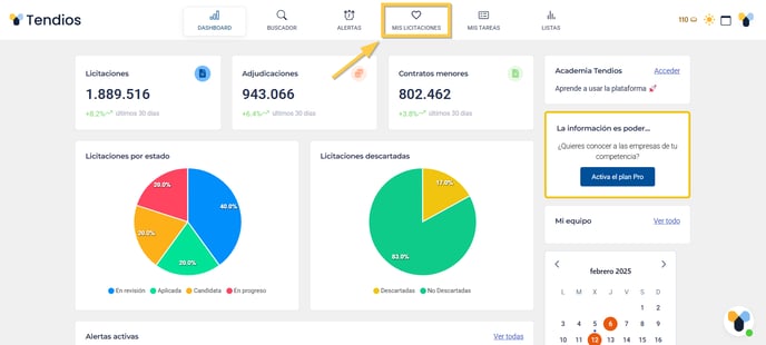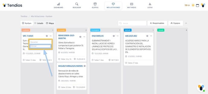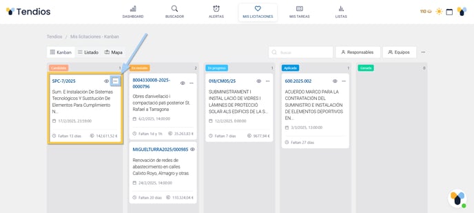 Encuentra la licitación que quieras eliminar de tus guardados y haz clic en su icono de los tres puntos situado arriba a la derecha.